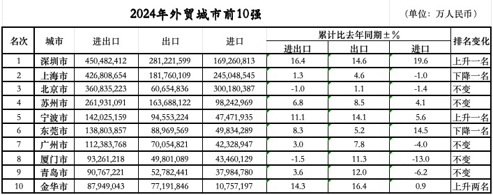 第一财经梳理海关总署的数据,2024年全国外贸前10强城市别离为:深圳、上海、姑苏、宁波、东莞、金华、广州、、杭州和青岛。比宁波更猛的是正在2023年排名第二的深圳,凭仗16。4%的增速跃升至2024年的全国外贸“冠军”。除了时隔9年后沉返内地外贸城市首位,深圳本身也实现了更多冲破2024年4。5万亿元的进出口规模为初次冲破4万亿,16。4%的同比增速别离较全国、广东省快11。4个、6。6个百分点。进口、出口也均为汗青新高,此中,出口2。81万亿元,增加14。6%,实现32连冠;进口1。69万亿元,增加19。6%。2024年全年8838万份报关单中的最初一张,记实的恰是深圳一家平易近营企业的出口消息。这张报关单为2024年中国外贸进出口画上了一个句号。也恰是正在这一年,深圳平易近营企业的外贸规模占比初次冲破7成。2024年,深圳平易近营企业有进出话柄绩企业数量近4。7万家,企业数量占比近9成,合计进出口3。16万亿元,增加24。2%,快于深圳市全体7。8个百分点,占同期总值的70。1%,比沉较2023年提拔4。4个百分点,成为拉动深圳外贸增加的次要动力。宁波的平易近营企业数量占比更是跨越了9成,外贸规模则接近8成。数据显示,2024年,宁波的平易近营企业数量已添加至近2。7万家,占同期宁波市外贸企业总数的90。9%,此中,外贸规模超亿元平易近营企业数量添加至1690家。同期,宁波平易近营企业进出口1。09万亿元,增加13%,占全市进出口总值的76。6%。进出口总值从第六名升至第五名之外,宁波的出口规模正在全国城市中排名第四,仅次于深圳、上海和姑苏。另一座正在2024年较着上升的城市是坐拥“世界小商品之都”义乌的金华。从2023年的第12位跻身全国前10强的跃升,也让金华初次超越杭州,浙江金华海关的动静称,2024年金华外贸规模再立异高,共实现外贸进出口总值8794。9亿元,同比增加14。3%,增速居浙江省首位。出口做为其强项,客岁金华出口达7719。2亿元,同比增加16。4%,占浙江省的份额为19。8%,创下汗青新高。金华的进出口近8成由义乌贡献,而义乌的平易近营经济占领了90%以上的市场从体、实现了90%以上的P。2024年前11个月,浙江省义乌市进出口总值就冲破了6000亿元,同比增加17。6%。此中出口5420。6亿元,同比增加17。4%;进口719。3亿元,同比增加19。0%,进出口、出口和进口值占全省份额别离为12。8%、15。2%和5。8%,占比别离提拔1。2、1。1和0。9个百分点。面临全球订单的碎片化趋向,市场采购模式对本地甚至周边的出口具有较着的拉动感化。2024年前11个月,义乌市通过市场采购商业体例出口4350。2亿元,同比增加21。7%,占义乌市出口总值的80。3%,拉动义乌市出口增加16。8个百分点。另据浙江中国小商品城集团股份无限公司数据,2024年,义乌中国小商品市场日均人流22。43万人次,此中日均外商超3900人,创10年新高。除了正在外贸前10强中实现了跃升的城市案例,从全国层面看,平易近营企业的贡献也正在持续提高。2024年,我国平易近营企业进出口24。33万亿元,增加8。8%,占全国外贸总值的比沉提拔至55。5%,继续成为外贸第一大运营从体。的数据还显示,2024年的平易近企进出话柄现了三个“初次”,别离是有进出话柄绩的平易近营企业数量初次跨越60万家,达到60。9万家;平易近营企业初次成为我国高手艺产物的最猛进出口从体;平易近营企业占我国消费品进口比沉初次跨越50%,同比提拔2。8个百分点至51。3%,生果等产物中比沉跨越六成。