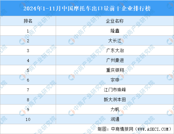 2024年1-11月中国摩托车出口量前十企业排行榜(附