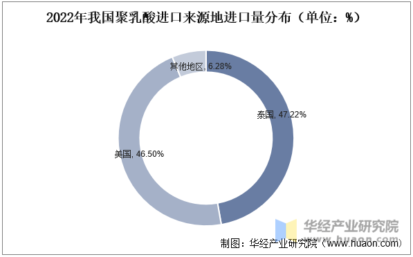 欧洲和是聚乳酸最大的市场,而因为中国、日本、韩国、印度和泰国等国对聚乳酸的需求处于持续增加之中,我国聚乳酸次要从泰国取美国进口,据统计,2022年我国从泰国进口聚乳酸9238。3万吨,从美国进口聚乳酸9096。7万吨,进口量合计占比93。72%。