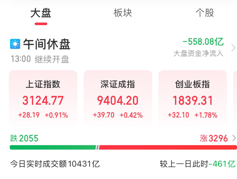 A股三大指数今日早盘集体反弹,截至午盘,沪指涨0。91%,深成指涨0。42%,创业板指涨1。78%,北证50指数涨3。83%。全市场半日成交额10431亿元,较上日缩量461亿元。全市场超3200只个股上涨,超100只个股跌停。